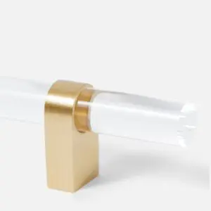 Uchwyt meblowy T-bar akryl przeźroczysty o długości pręta 80 mm i stopą w kolorze mosiądz szczotkowany. Akryl cechuje się wysoką czystością i prostym wykończeniem.
