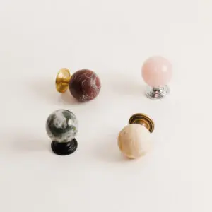 Gałka kamienna na mosiężnej podstawie w czterech kolorach, mosiężnym szczotkowanym, czarnym, srebrnym połysku oraz mosiężnym starzonym, o średnicy 30mm. Uchwyt występuje w wielu wykończeniach.