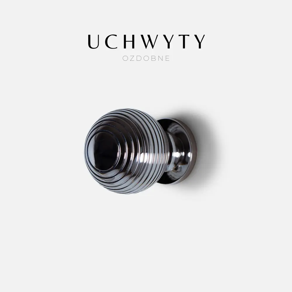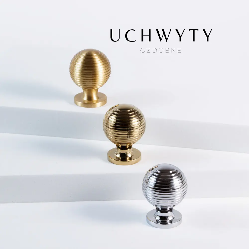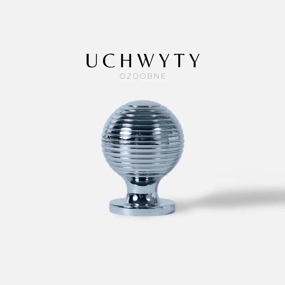 Gałka mosiężna kulka z prążkami, w wykończeniu srebrny połysk. Uchwyt występuje w wielu kolorach, w komplecie znajdują się również uchwyty relingowe.