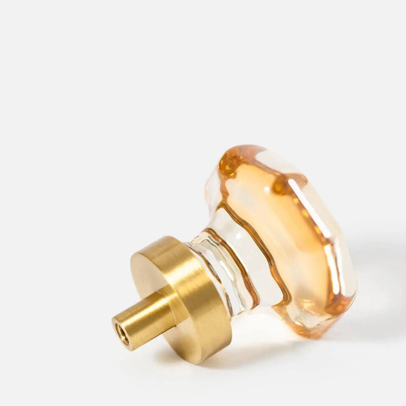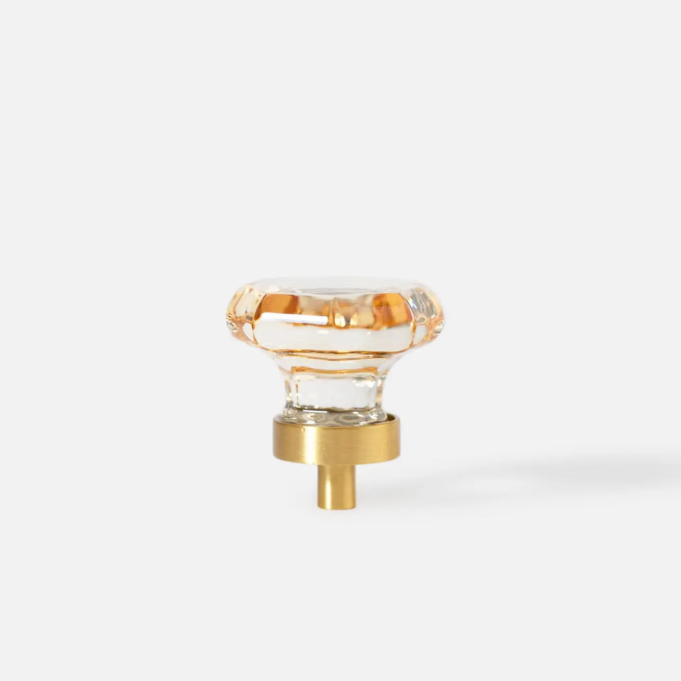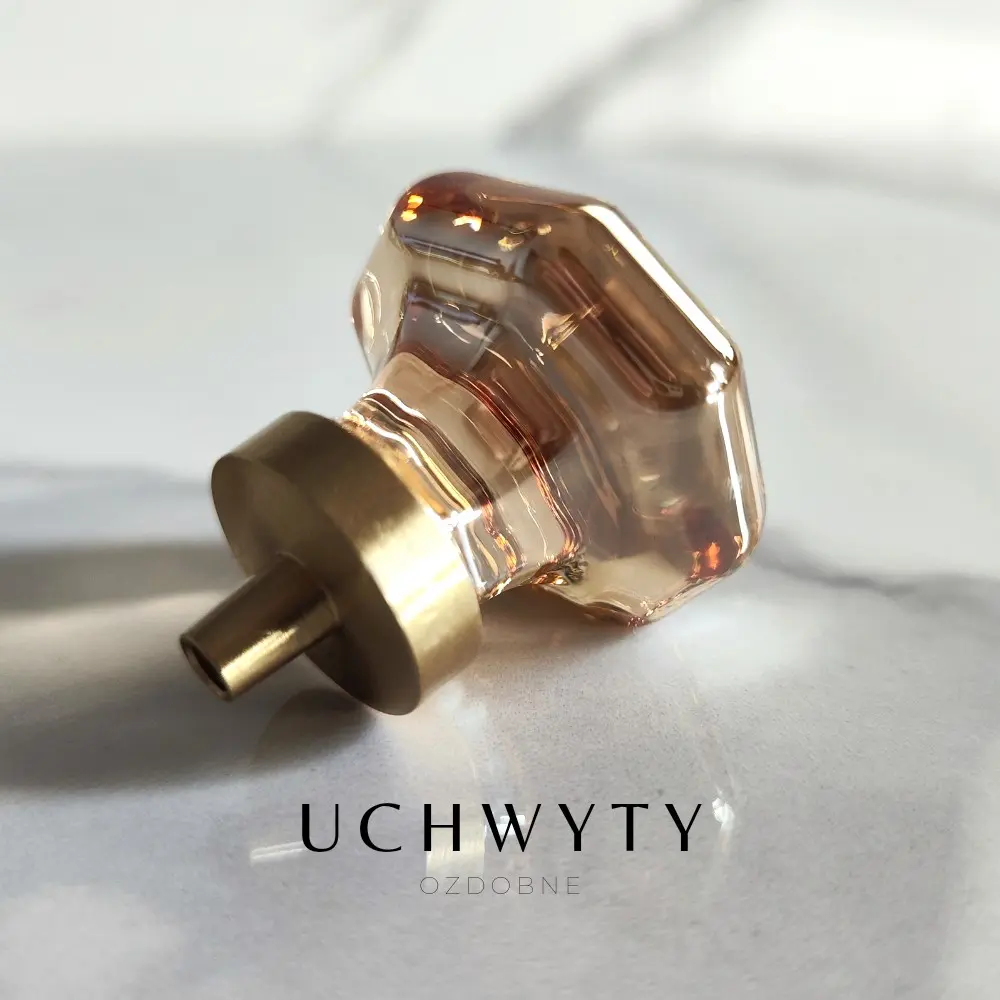 Mosiężna gałka meblowa ośmiokąt, szkło kryształowe kolor szampański. Średnica: 36 mm; Wysokość ze stopą: 25 mm.