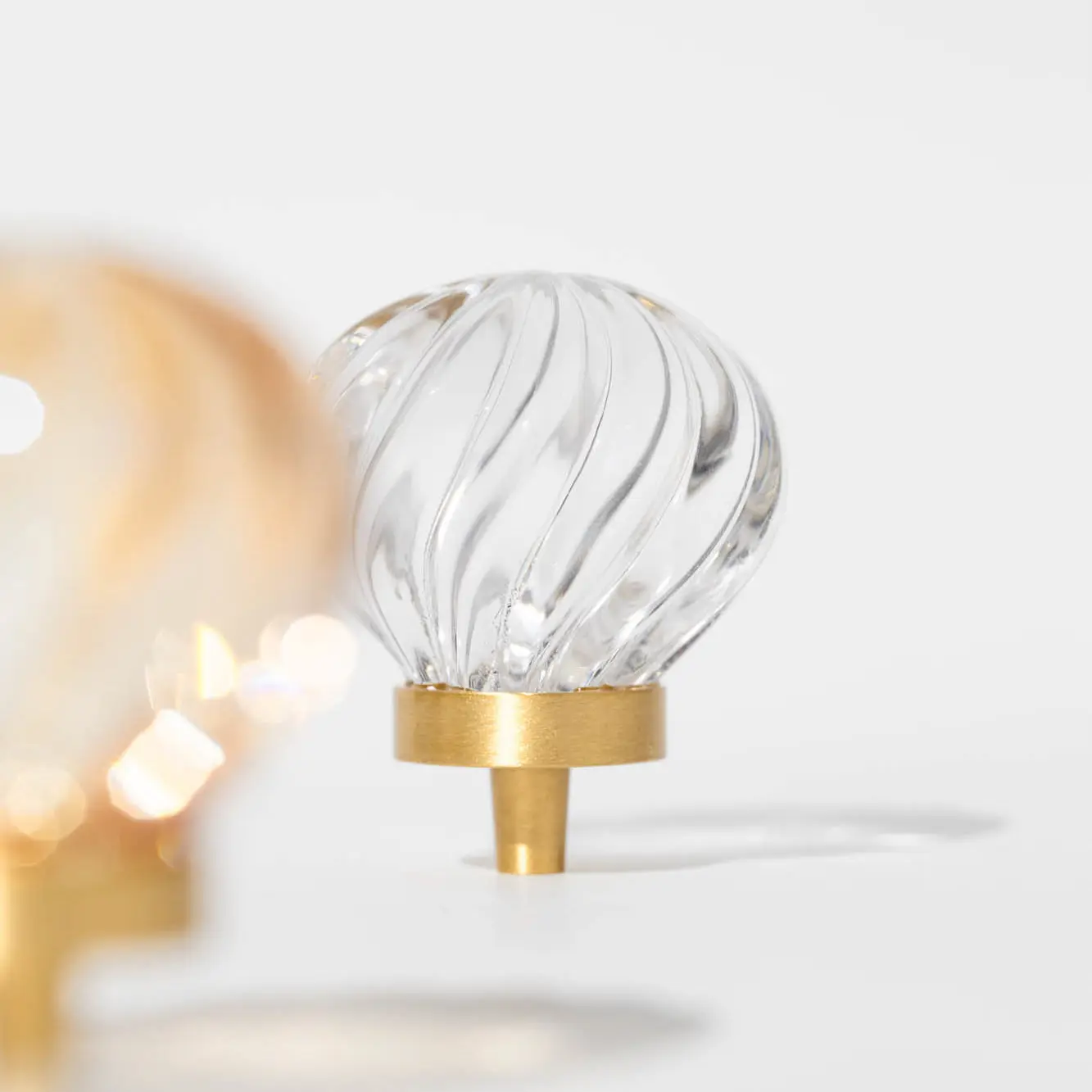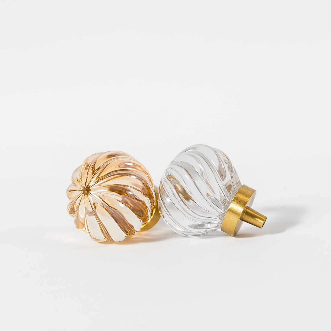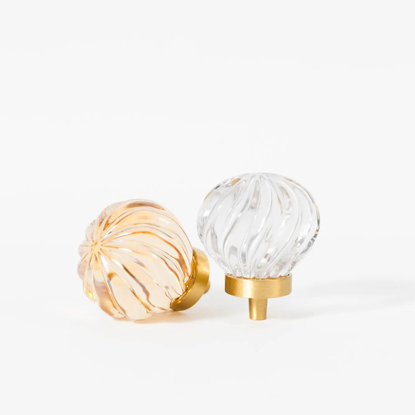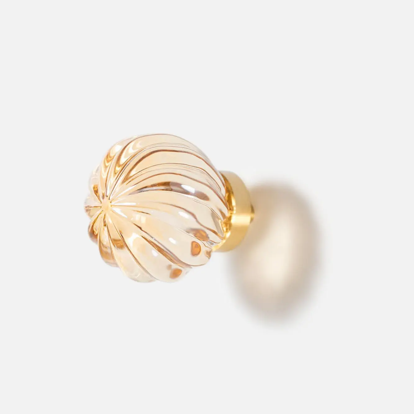 Mosiężna gałka meblowa kula ze skośnymi prążkami, szkło kryształowe kolor szampański. Średnica: 30 mm; Wysokość ze stopą: 31 mm.