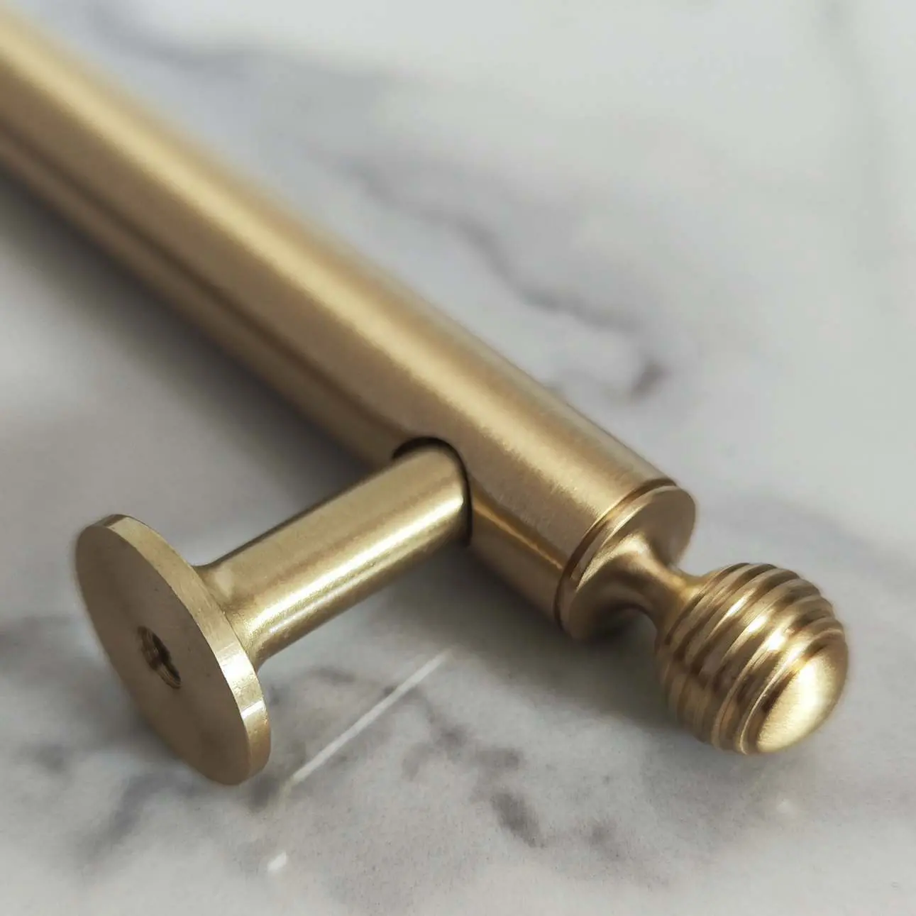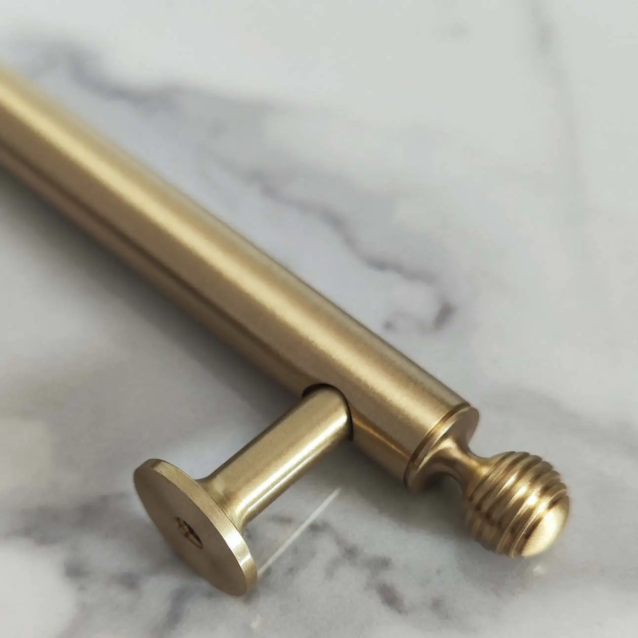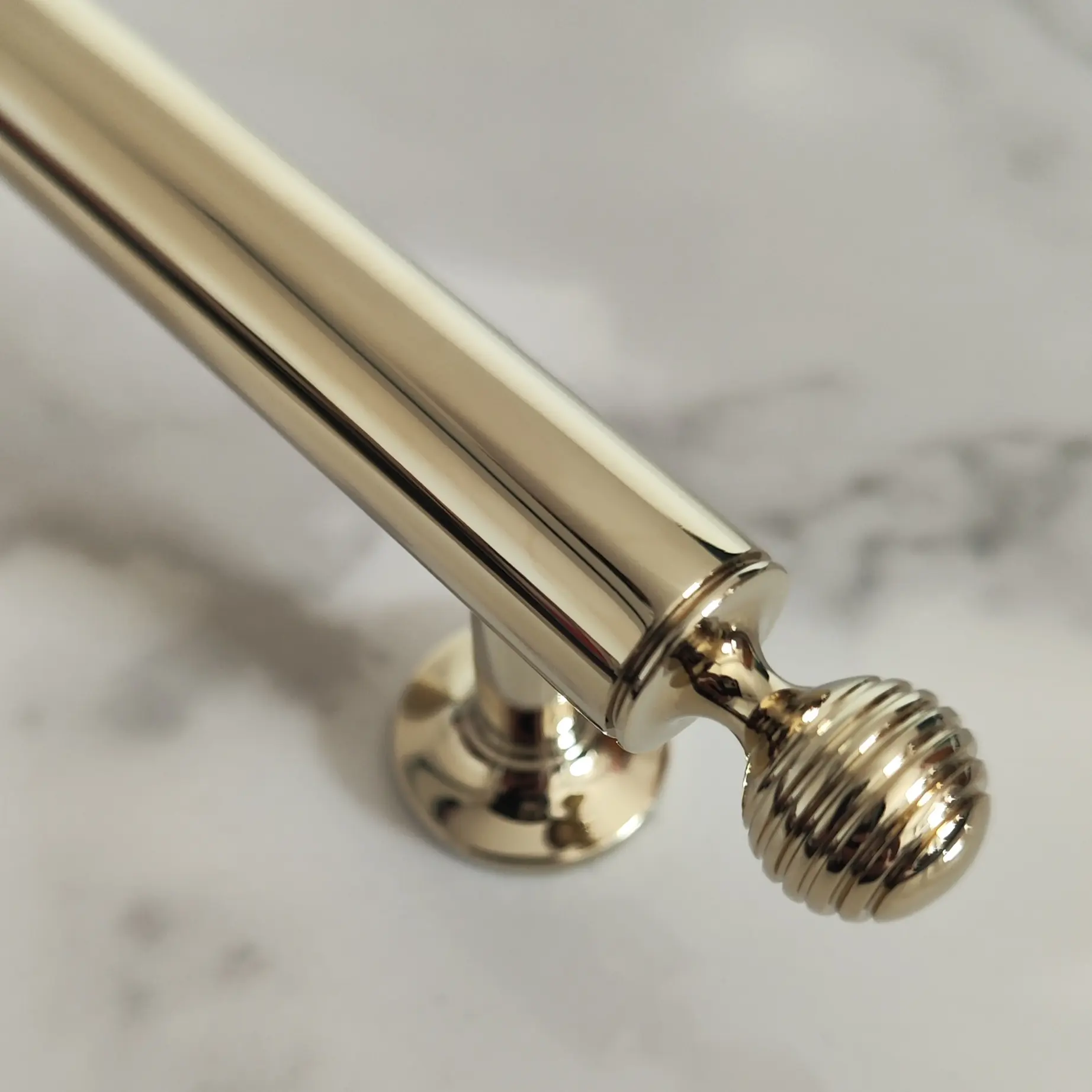 Uchwyt meblowy – relingowy mosiężny złoty połysk z małymi gałeczkami na końcach.