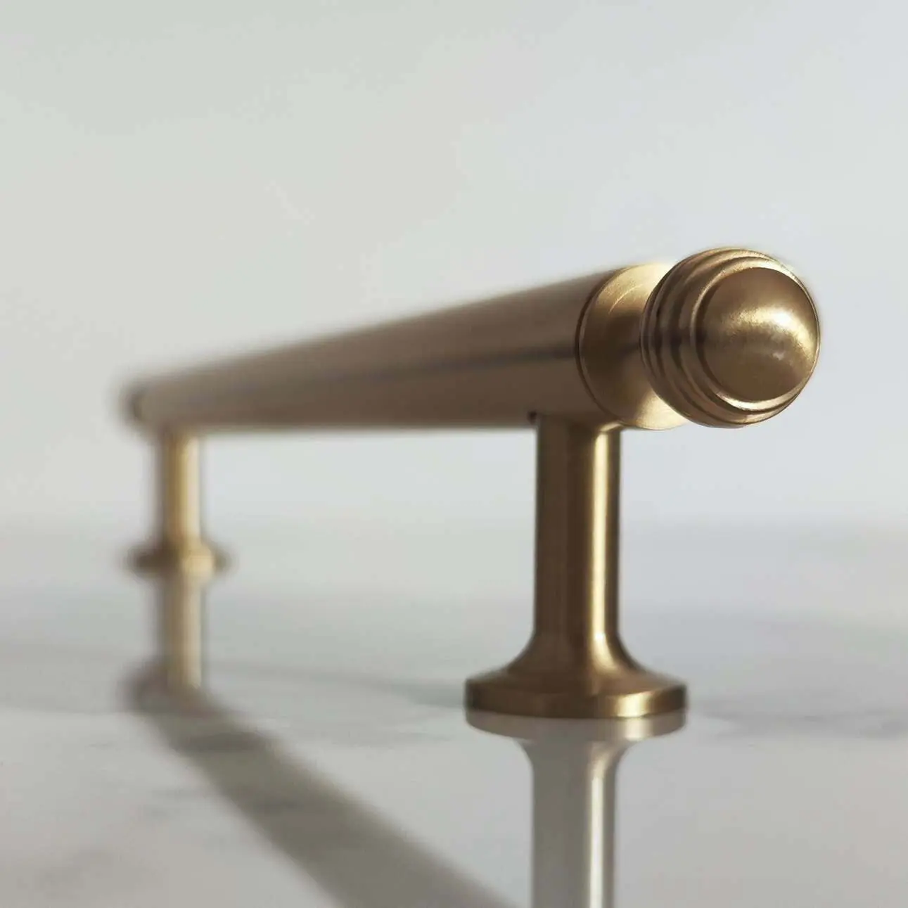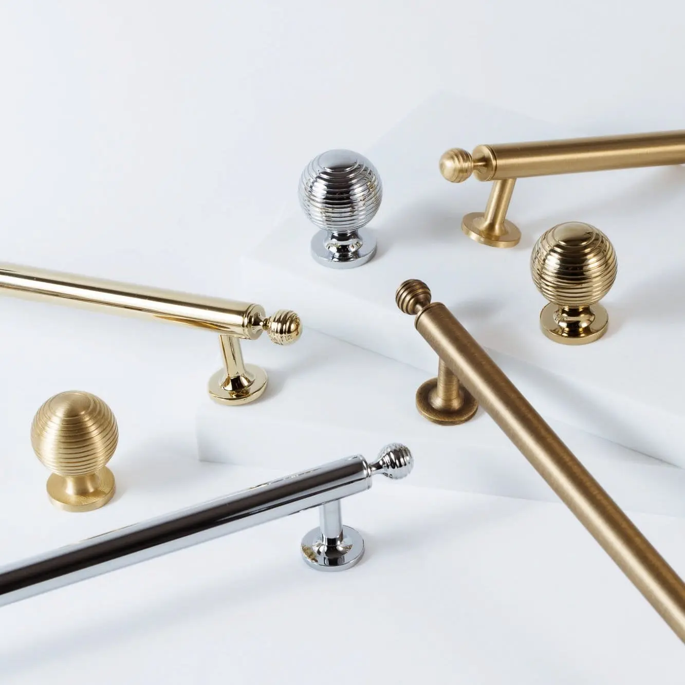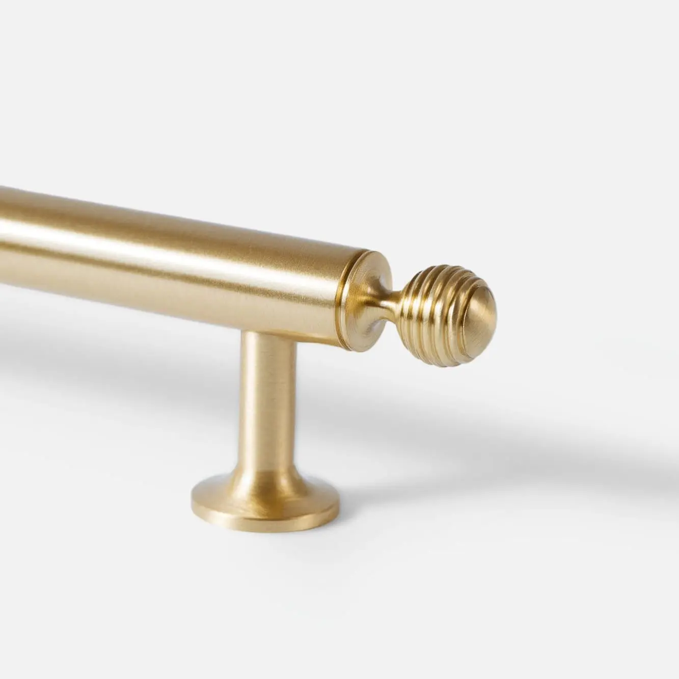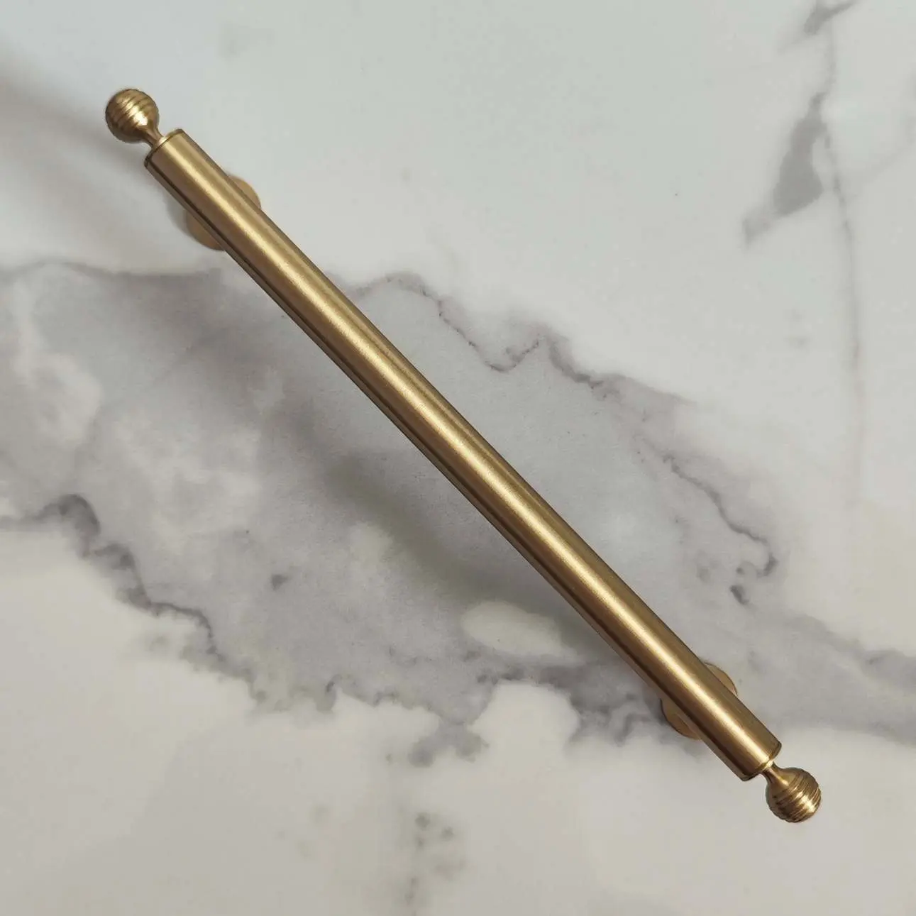 Uchwyt meblowy – relingowy mosiężny złoty połysk z małymi gałeczkami na końcach.