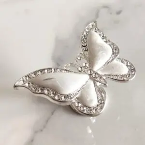 Ozdobna gałka meblowa w kształcie Motyla w kolorze srebrnym, z masą perłową w biało-różowym kolorze i cyrkoniami. Występuje w różnych wariantach kolorystycznych.