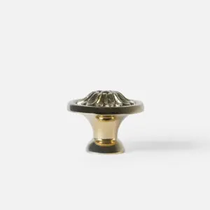Mosiężna gałka meblowa spłaszczona, szkło kryształowe kolor przeźroczysty. Uchwyt występuje w wielu kształtach i dwóch kolorach.