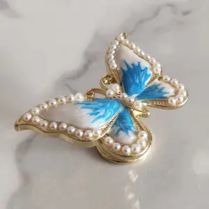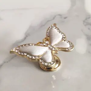Ozdobna gałka meblowa w kształcie Motyla w kolorze złotym, z masą perłową biało-niebieską i perełkami. Występuje w różnych wariantach kolorystycznych.