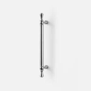 Klasyczny mosiężny uchwyt meblowy relingowy o długości 350 mm. Model występuje w trzech długościach i w kolorze srebrny połysk.
