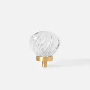Mosiężna gałka meblowa kulka ze skośnymi prążkami, szkło kryształowe kolor przezroczysty. Uchwyt występuje w wielu kształtach i dwóch kolorach.