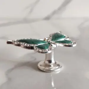 Ozdobna gałka meblowa w kształcie Motyla w kolorze srebrnym, z masą perłową w zielonym kolorze i cyrkoniami. Występuje w różnych wariantach kolorystycznych.