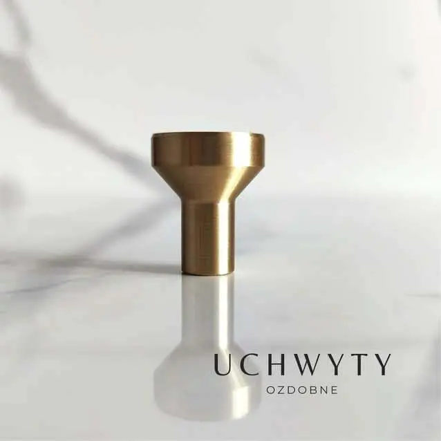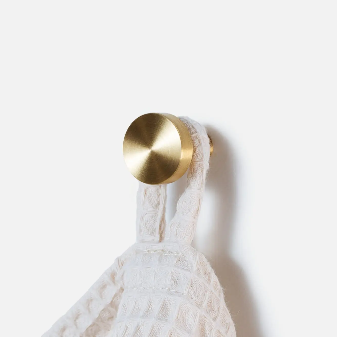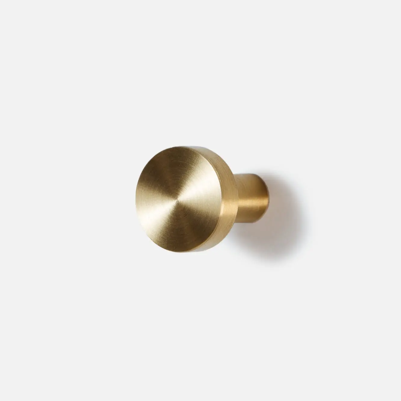 Wieszak na ubrania i ręczniki mosiężny z delikatnie szczotkowaną powierzchnią wzór W6 – mały. Średnica górna : 20 mm; średnica dolna: 10 mm Wysokość ze stopą: 25 mm.